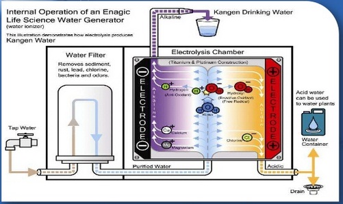 Các khoáng chất mang điện tích dương Ca, Mg, Zn, Fe, Cr, K… được hút vào cực âm và sau quá trình điện phân được đưa lên vòi trắng ra nước Kangen có độ PH= 8,5-9,5 (Tỷ lệ 2/3) Các chất còn lại mang điện tích âm như O-, Cl-… được hút vào cực dương và điện phân đưa ra vòi trăng phía dưới tạo ra nước chăm sóc sắc đẹp có PH 5,5-6,5 (Tỷ lệ 1/3) phù hợp với da liễu sử dụng để rửa mặt, gội đầu…