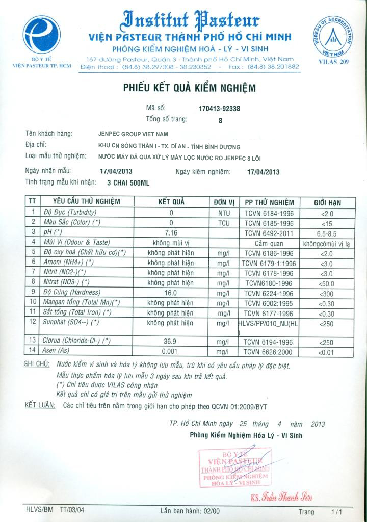 + Phiếu xét nghiệm lý - Hóa - Sinh ( Qua máy lọc nước Jenpec ).