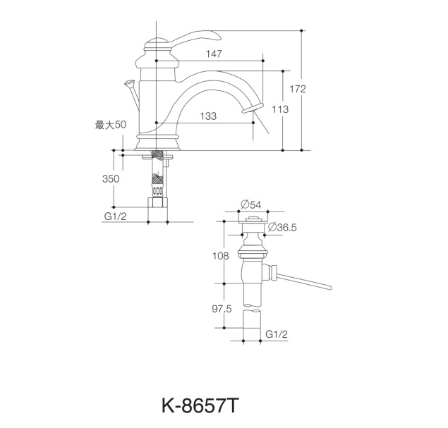 + Hình ảnh bản vẽ kỹ thuật lắp đặt Vòi chậu rửa Kohler Lavabo Fairfax 8657-T HK 1202